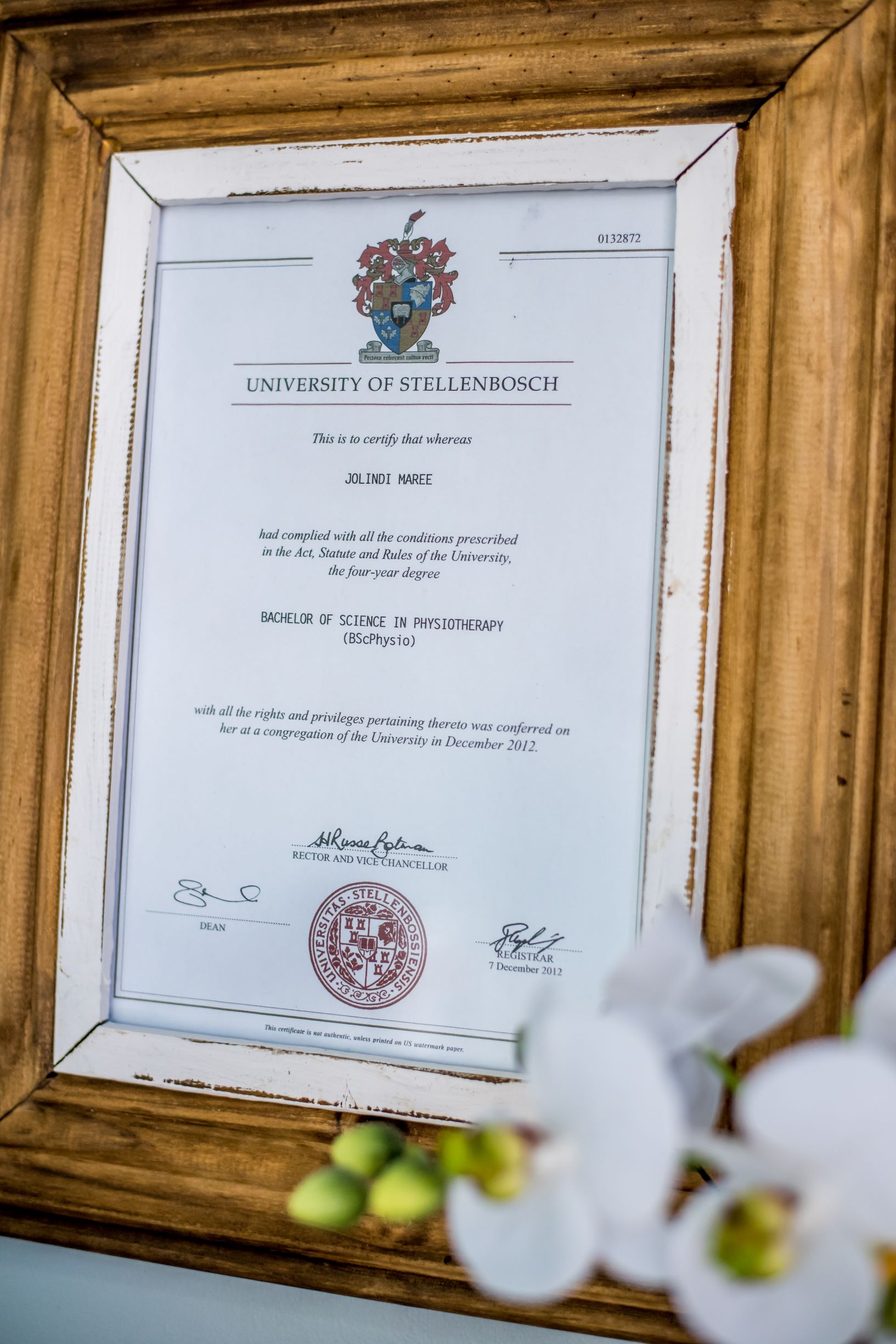 Jolindi graduated from the University of Stellenbosch in 2012. After her graduation she completed her Community service year at Potchefstoom sub district hospital (Ventersdorp hospital/Potchefstroom hospital/Witrand hospital (Psychiatric hospital) ) also did an outreach project at Ikalafeng school for children with mental and physical disabilities. Was involved in Rugby clubs (Maties Rugby union, Durbanville Rugby and NWU PUK Rugby union).